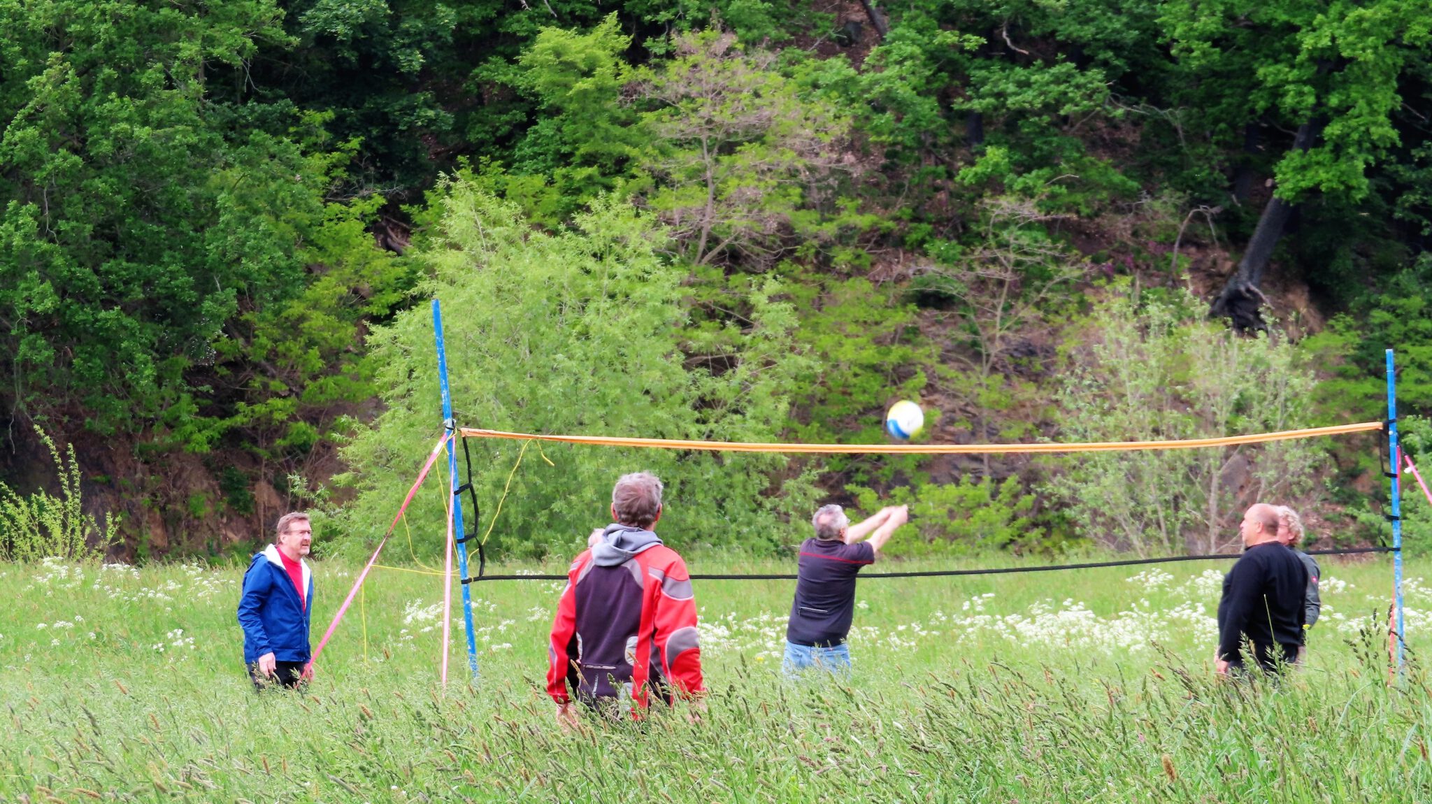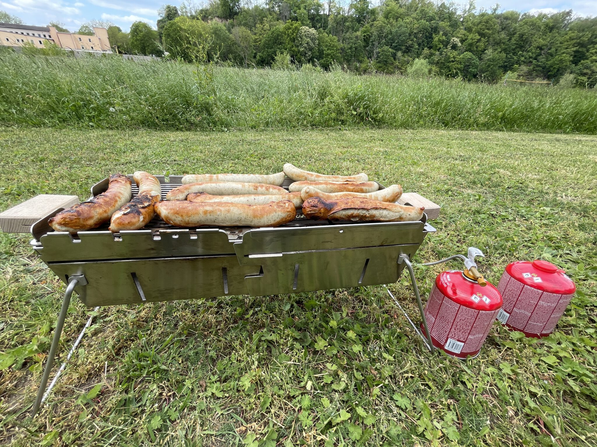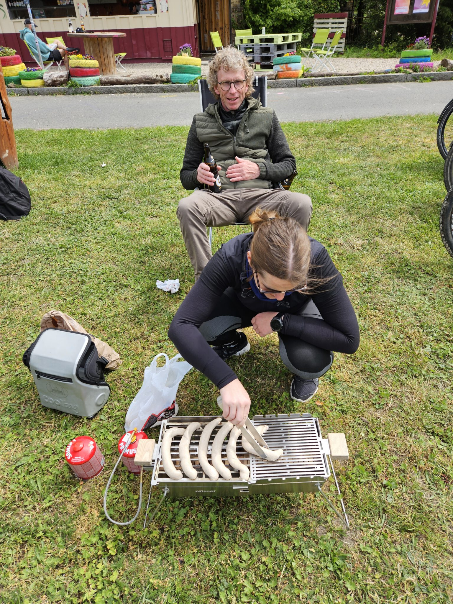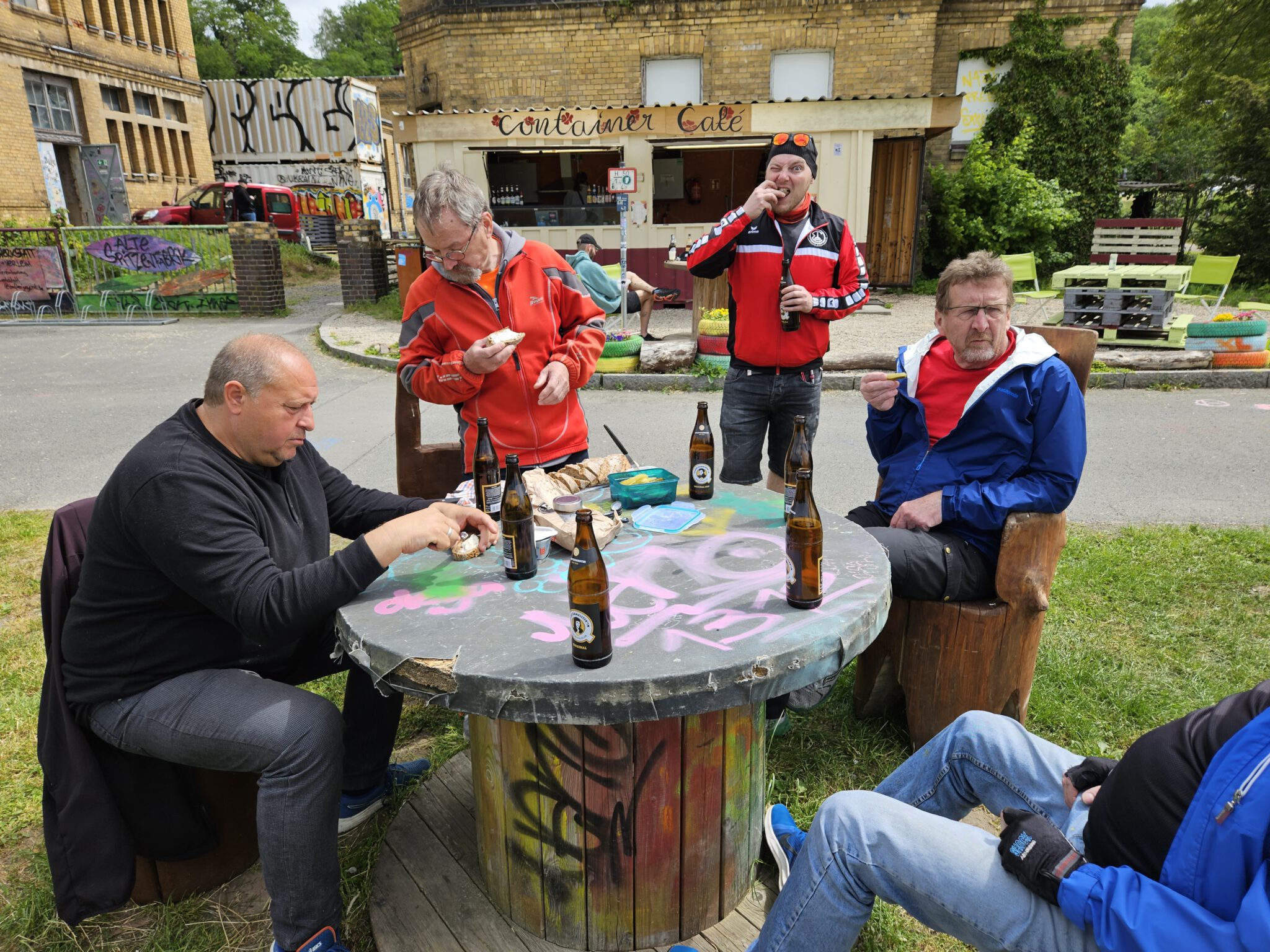 Nach 1 Stunde Rast fanden wir zurück auf den gut aspaltierten Radweg, der Dank Rückenwind eine zügige Fahrt erlaubte. So gelangten wir bald nach Neichen. Das ehemalige Bahnhofsgelände lud Dank Sonnenschein zu einer kurzen Pause ein. Dann ging es weiter Richtung Grimma. Am Ortseingang sollte an der ehemaligen Taschenfabrik bei hoffentlich geöffnetem Container-Café der nächste Halt erfolgen. Es hatte! Jetzt kam der große Auftritt von Frau Smutje Laura. Sie blies ihren Fahrradgrill auf und flambierte eine Runde Bratwürste, die Manfred mitgebracht hatte. Der ersten Hunger bis zur Bratwurstreife konnte zusätzlich durch frisches Brot und Schmalz aus Manfreds Rucksack gestillt werden. Die Restgrillzeit wurde auf dem nahen Volleyballplatz verbracht.