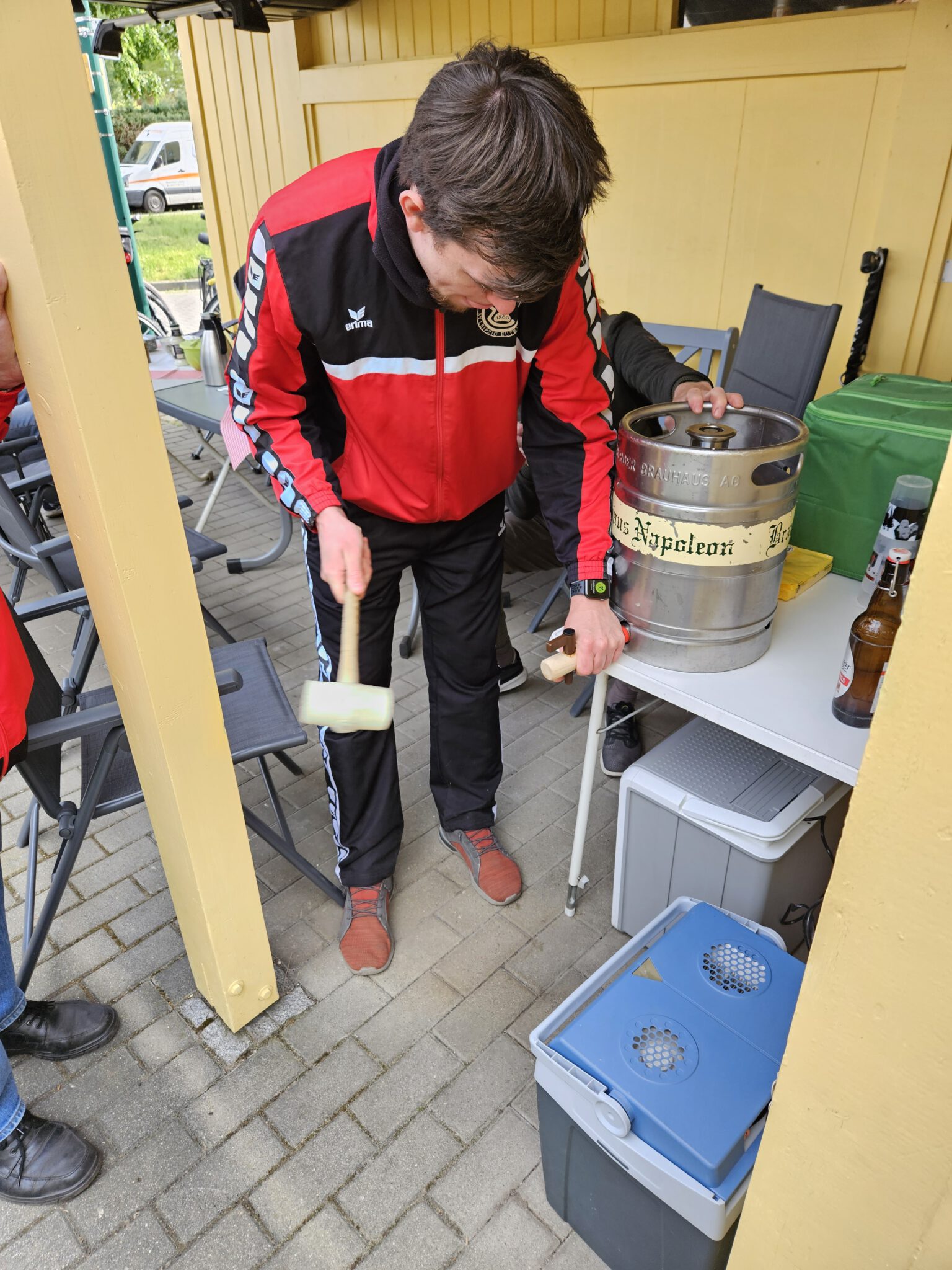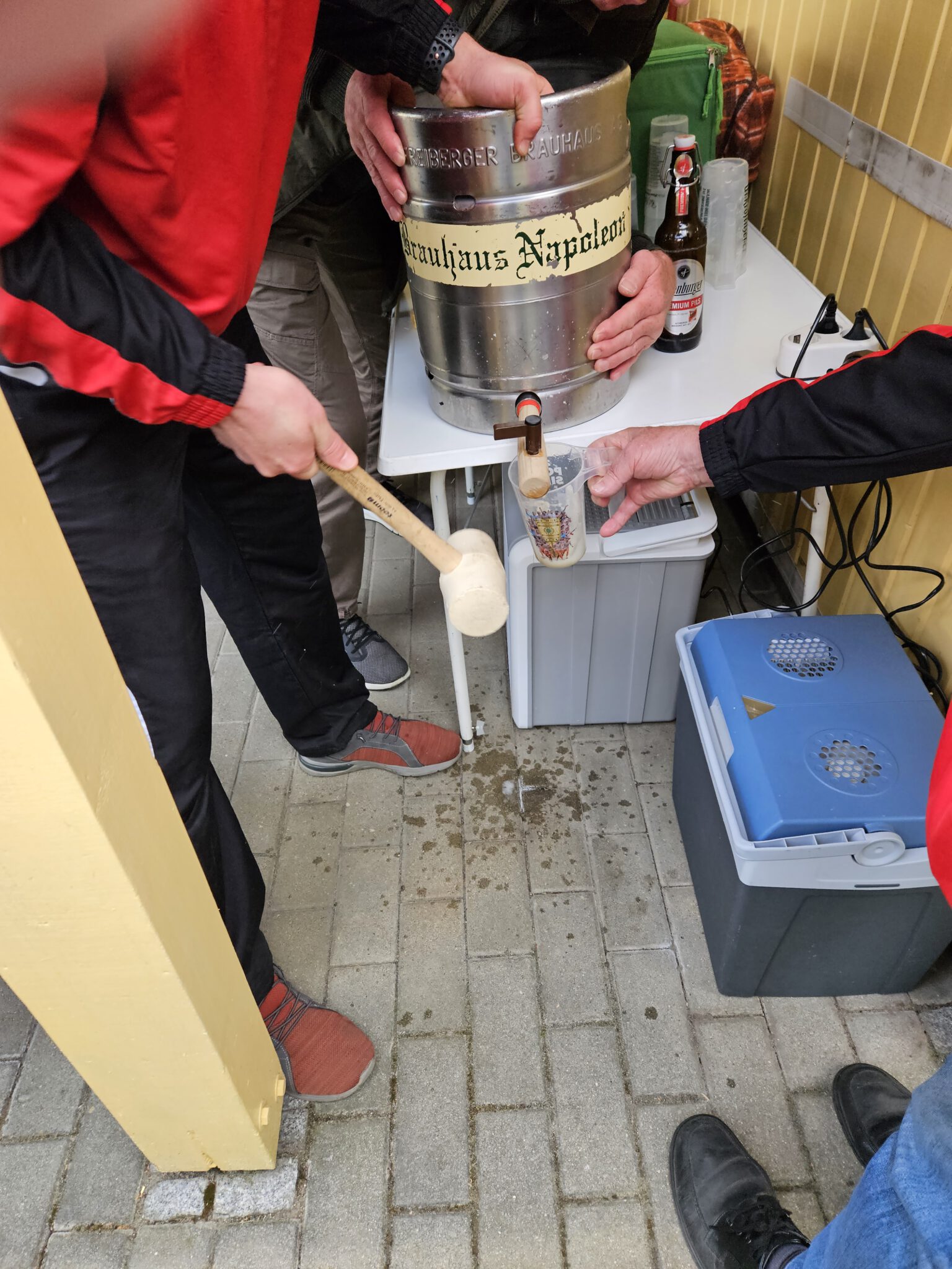 Da wir schon wieder aus dem Zeitplan geraten waren, konnten wir den Kasten Altenburger Helles nicht vollständig leeren. Schließlich hatte Horst noch wichtige Vorbereitungsarbeiten für das spätnachmittägliche Abtrainieren zu erledigen. So begaben wir uns auf die verbleiben 18 km bis nach Probstheida, die wir in einer reichlichen Stunde bewältigten. Kurz vor dem Ziel verloren wir dann noch Steffen Hilbig, der es vorzog, den Rest des Nachmittags in Familie zu verbringen. Im Ziel unter Olafs Carport hatte Horst zwischenzeitlich das gut gekühlte Bierfass aus der Gasthausbrauerei Napoleon positioniert. Freddy oblag es, den Anstich vorzunehmen. Oktoberfestuntypisch gelang dies erst nach gefühlten 25 Schlägen. Das frische Pils schmeckte trotzdem. Die Zeit bis zur Schwärzung von Grillfleich und -wurst konnte mit Fettbemmen überbrückt werden, die Birgit bereits griffbereit positioniert hat. Angelockt von Grillgeruch und Pilsduft kamen dann noch Dieter Hüfte und seine Pflegekraft Ines vorbei. Auch Steffen hatte sich ein C-Taxi bestellt. Thomas ließ später auch noch blicken.
