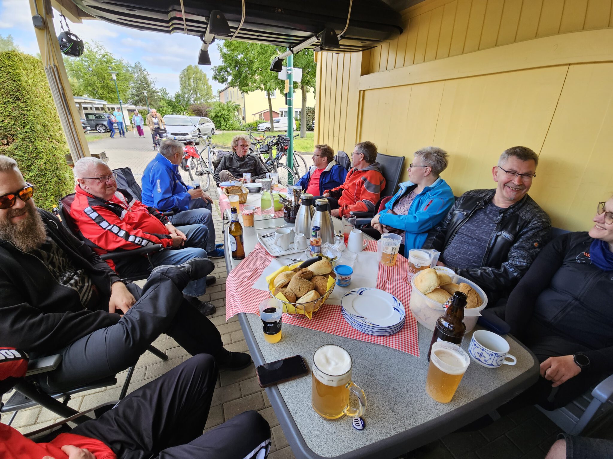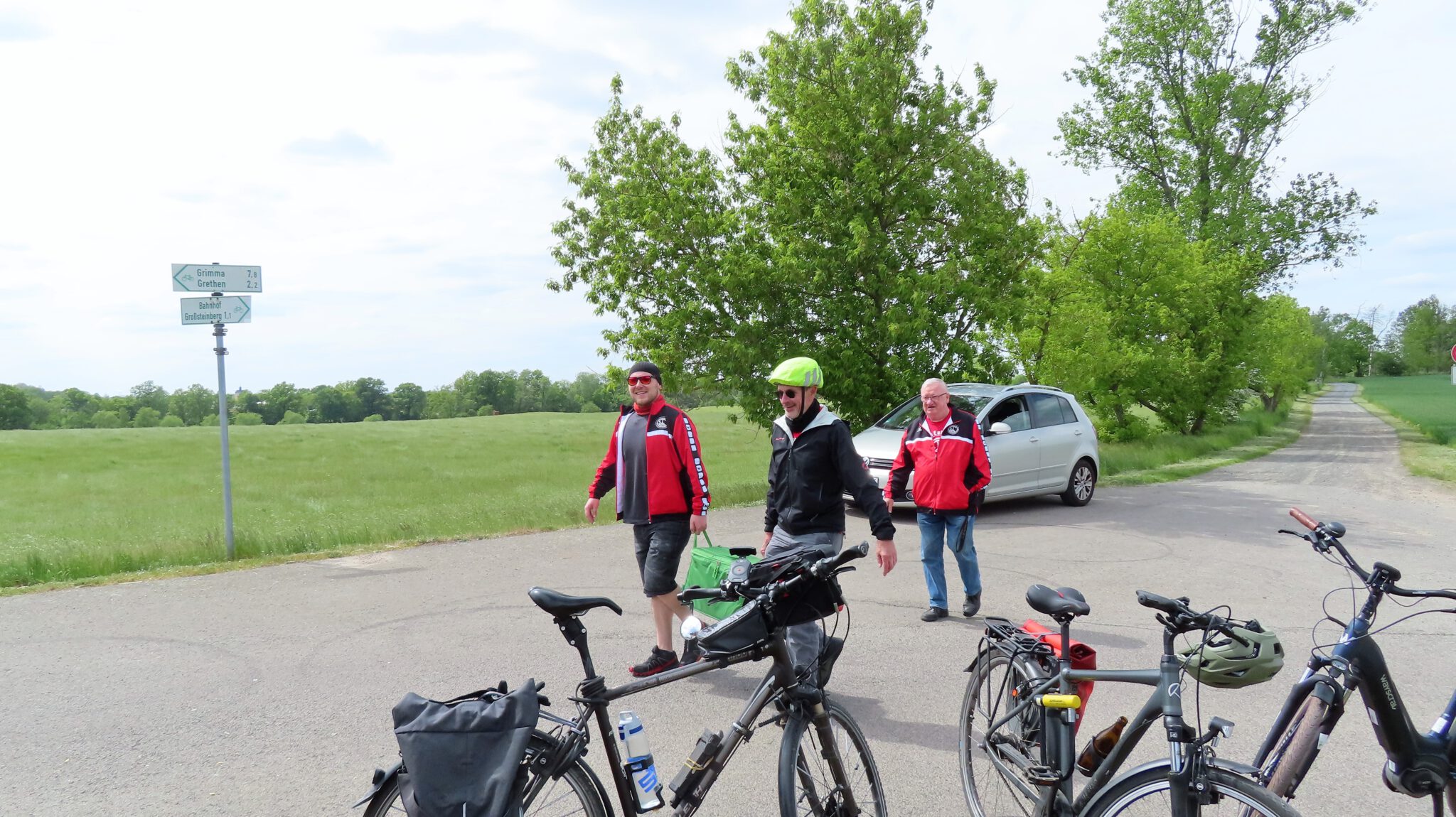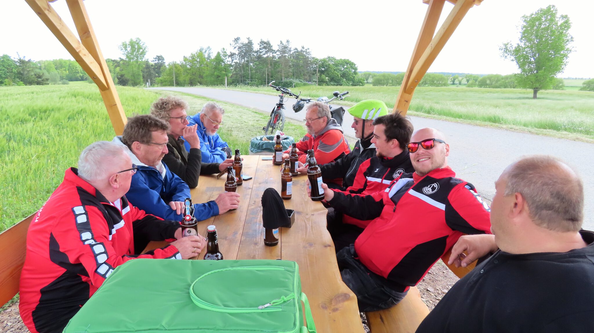 Frisch gestärkt wartete nun die erste und einzige Bergwertung aus dem Muldental heraus auf uns. Am Ende hatte niemand konditionelle Probleme. Vermutlich zog auch die Erwartung auf die nächste Tränke nahe Großsteinberg alle den Berg hoch. Auf eine Anhöhe südlich des Ortes wurde extra für uns eine überdachte Sitzgruppe positioniert und Horst versorgte uns traditionsgemäß aus seinem Kofferraum. Hin und wieder ließ sich die Sonne blicken und Docki testete gleich seine neue Sonnenlotion.